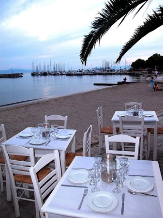 Τα εξωτερικά τραπέζια απολαμβάνουν την θαυμάσια θέα κατά μήκος της παραλίας και ξεσηκώνουν την διάθεση μας για "ροματζάδα" και για μια "βουτιά" μιας και η παραλία βρίσκεται στα πόδια μας.